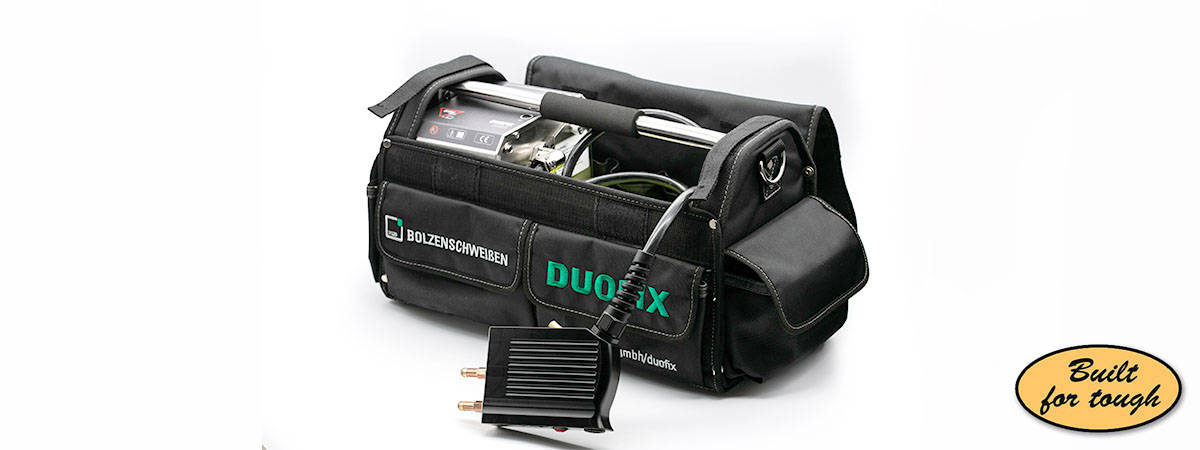 Integriert in komfortabler Transporttasche mit viel Platz für Werkzeug und Materialien. Leistungsfähiger Akku für bis zu 600 Doppelschweißungen (optional bis zu 700).